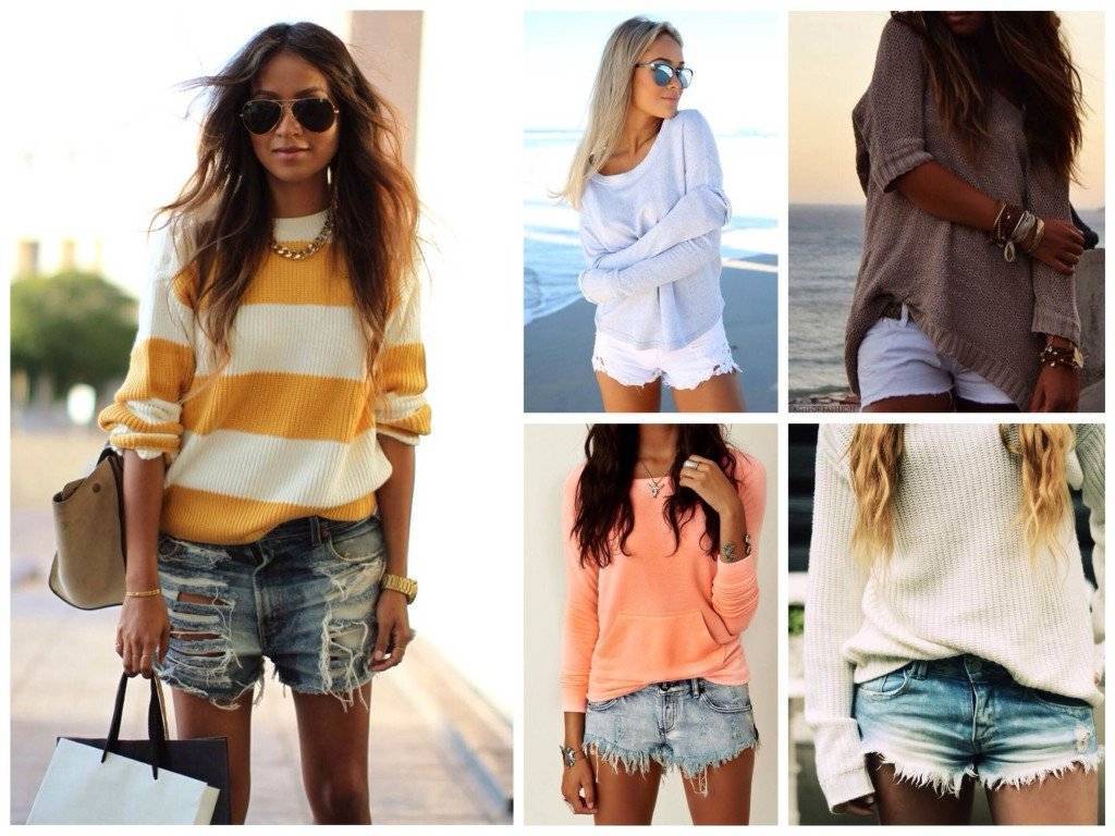 Для приятных летних прогулок и походов по магазинам идеально подойдет сочетание шорт с джемпером свободной кроя. В таком наряде легко и комфортно. Примерьте не только классический джемпер, но и модели в стиле оверсайз. Под последние лучше одевать джинсовые шорты с завышенной талией.