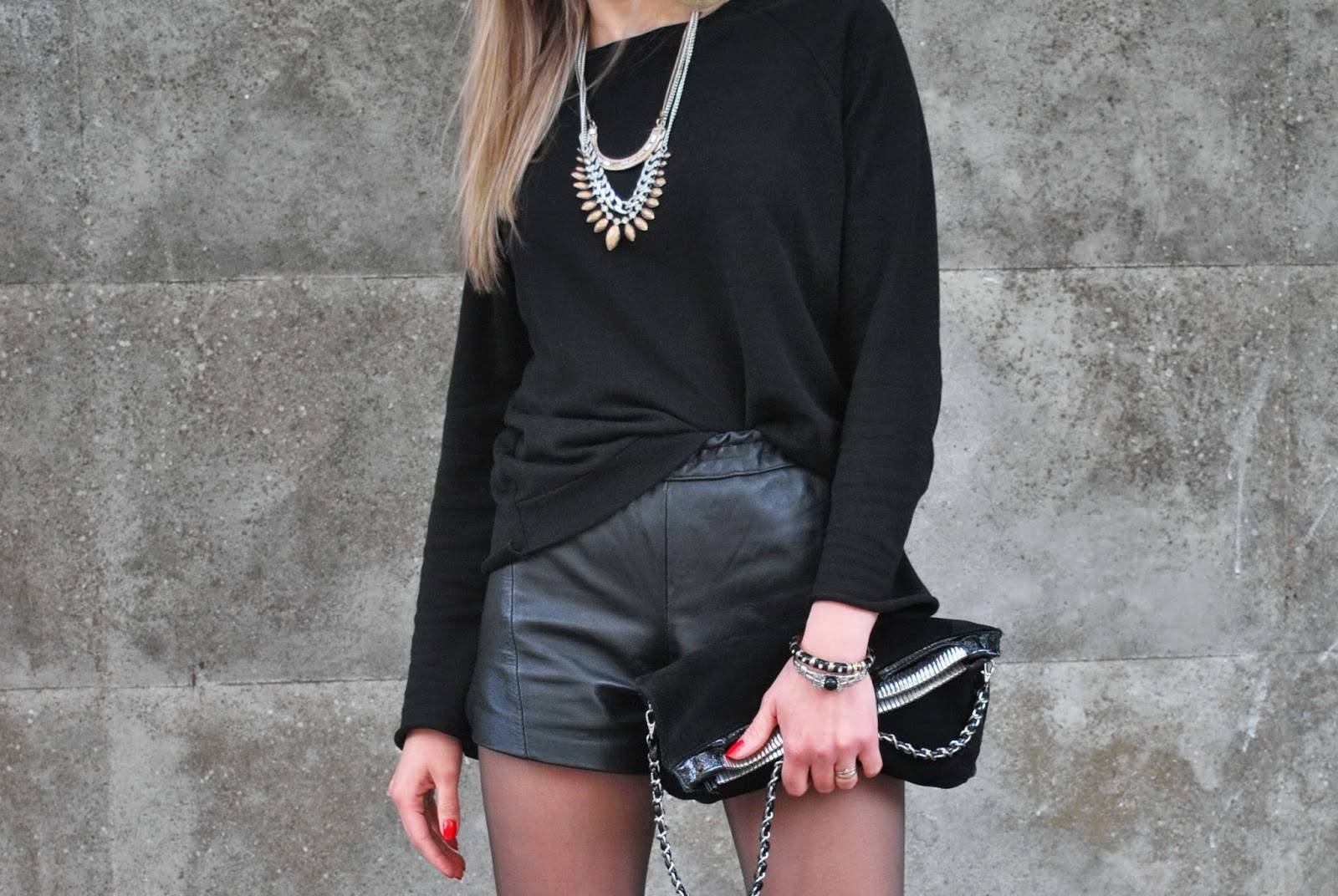 Самый беспроигрышный вариант – это подбор данного низа в тон к колготкам. Это наиболее безопасное сочетание, особенно, если оно выдержано в темной палитре. Такой прием поможет сделать шорты более сдержанными на вид (в этом в первую очередь нуждается смелая кожаная фактура) и визуально удлинит ноги.