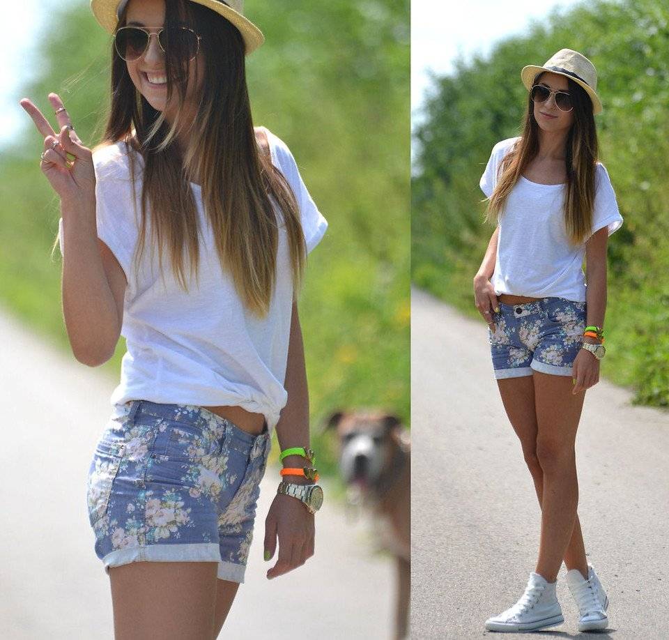Здесь мы предлагаем вам пробовать самые разные цветовые решения, желательно, чтобы они были яркими (например, лимонно-желтый очень хорошо сочетается с джинсой), главное, чтобы цвет подходил оттенку вашей кожи и волос. Помните, белая полупрозрачная блузка — всегда к вашим услугам, к ней лишь следует добавить какую-нибудь золотую изюминку (кулон, оправу очков, пояс или браслет) и туфли-лодочки на среднем или высоком каблуке. Еще один аксессуар, который уместен как конкретно в этом образе, так и в луках с другими блузками — это шляпка со средними полями (необязательно соломенная). С джинсовыми шортами также прекрасно смотрится разного рода принт, например, мелкий цветочный (в ансамбле с балетками или босоножками на танкетке, вы будете выглядеть очень нежно)