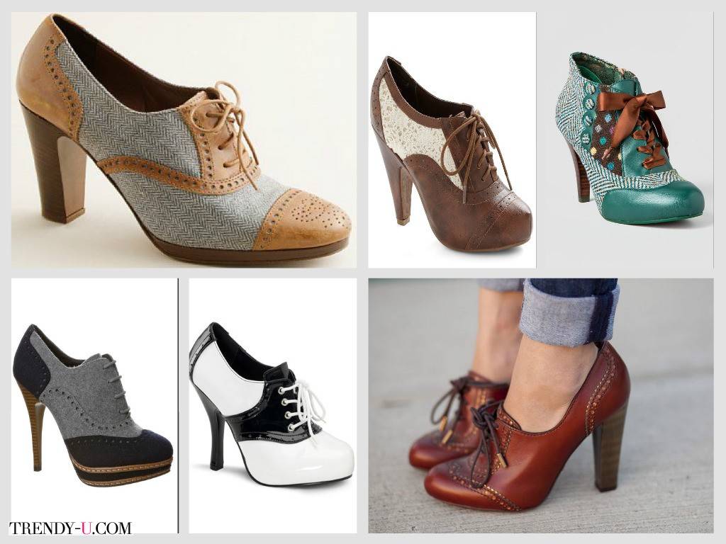 Обилие расцветок сделало оксфорды популярными, вместо привычного каблука в 1,5 сантиметра, появились модели с высотой каблука до 8,5 сантиметра.