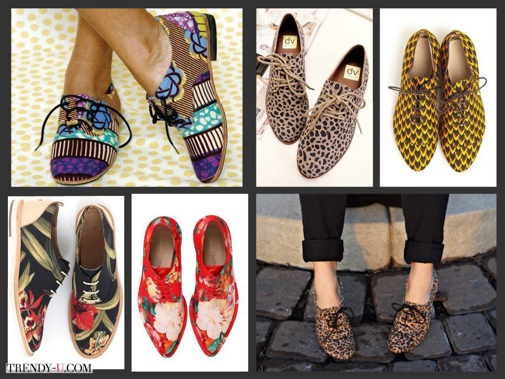 Оригинально смотрятся оксфорды, декорированные принтом: геометрическим, анималистическим или растительным.