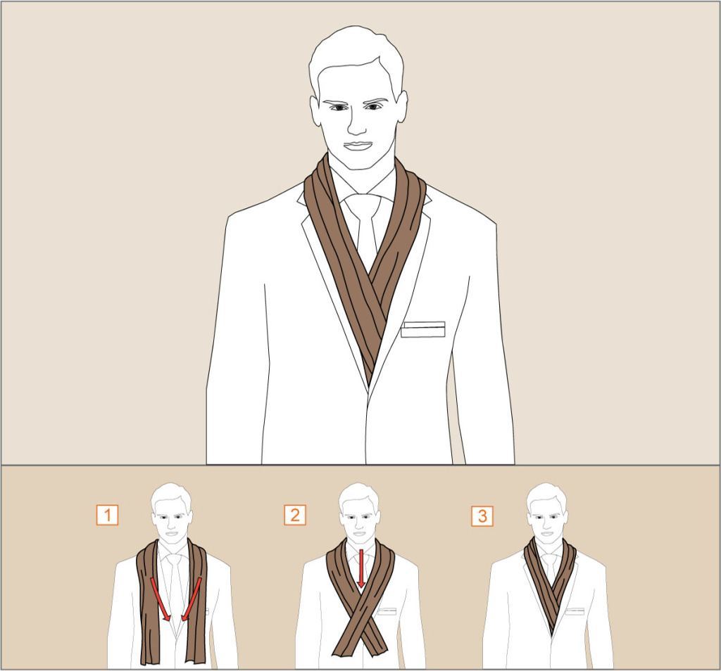 Как завязать шарф: просто накиньте шарф на шею и, при необходимости, заправьте концы во внутрь пиджака вдоль линии лацканов пиджака.