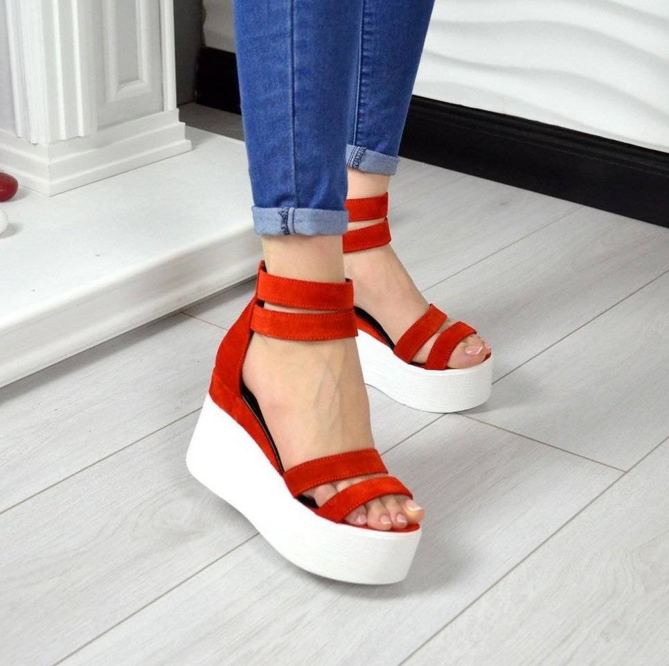 - Танкетка. Такой вариант – это как бы промежуток между массивными изделиями на платформе и открытыми туфлями на каблучке. У красных босоножек на танкетке имеется большая площадь опоры, поэтому они являются очень удобной моделью.