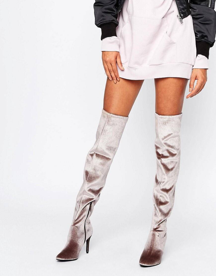 - Сапоги выше колена из бархата на устойчивом каблуке нужно сочетать с одеждой в тон, так как бархат сам по себе дает акцент за счет броской фактуры.
