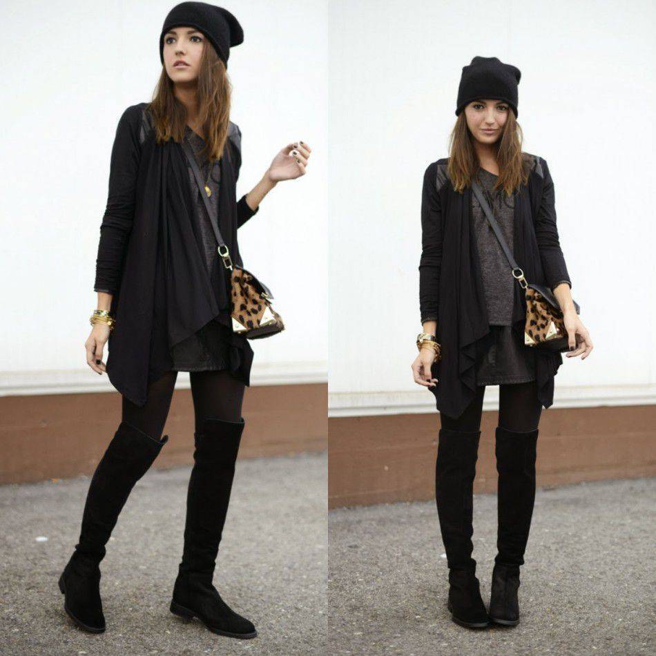 - Однотонный длинный объёмный свитер или свитер-платье, серая шляпа, чёрная или тёмно-коричневая сумка.