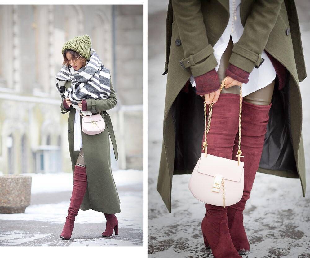 Если с платьями и вещами на каждый день все более-менее понятно, то разобраться какая верхняя одежда будет нормально смотреться с такими сапогами, бывает сложно. Нужен такой же оттенок или подойдет контрастный? Попробуем разобраться в этом вопросе.
