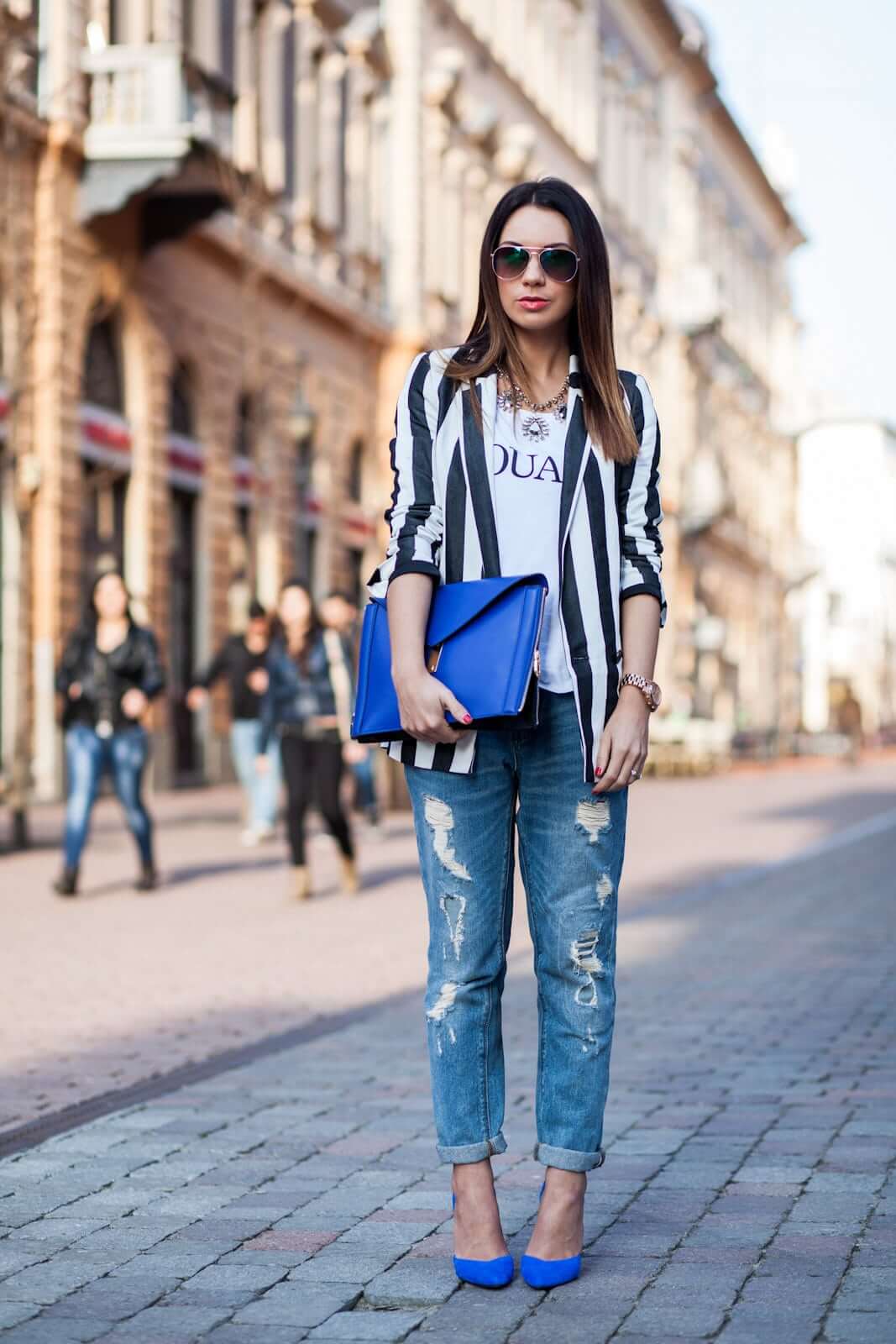 Модные рваные джинсы, черный удлиненный топ, черный жакет, а также синие туфли из замши будут смотреться просто фантастически стильно.