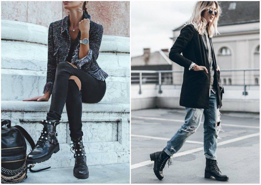 Под более нарядные образы с брюками или юбками, плащами и пальто лучше носить ботинки на толстом каблуке или шпильке. Также подобные образы прекрасно дополнят модели на тракторной подошве, создав контраст стилей.