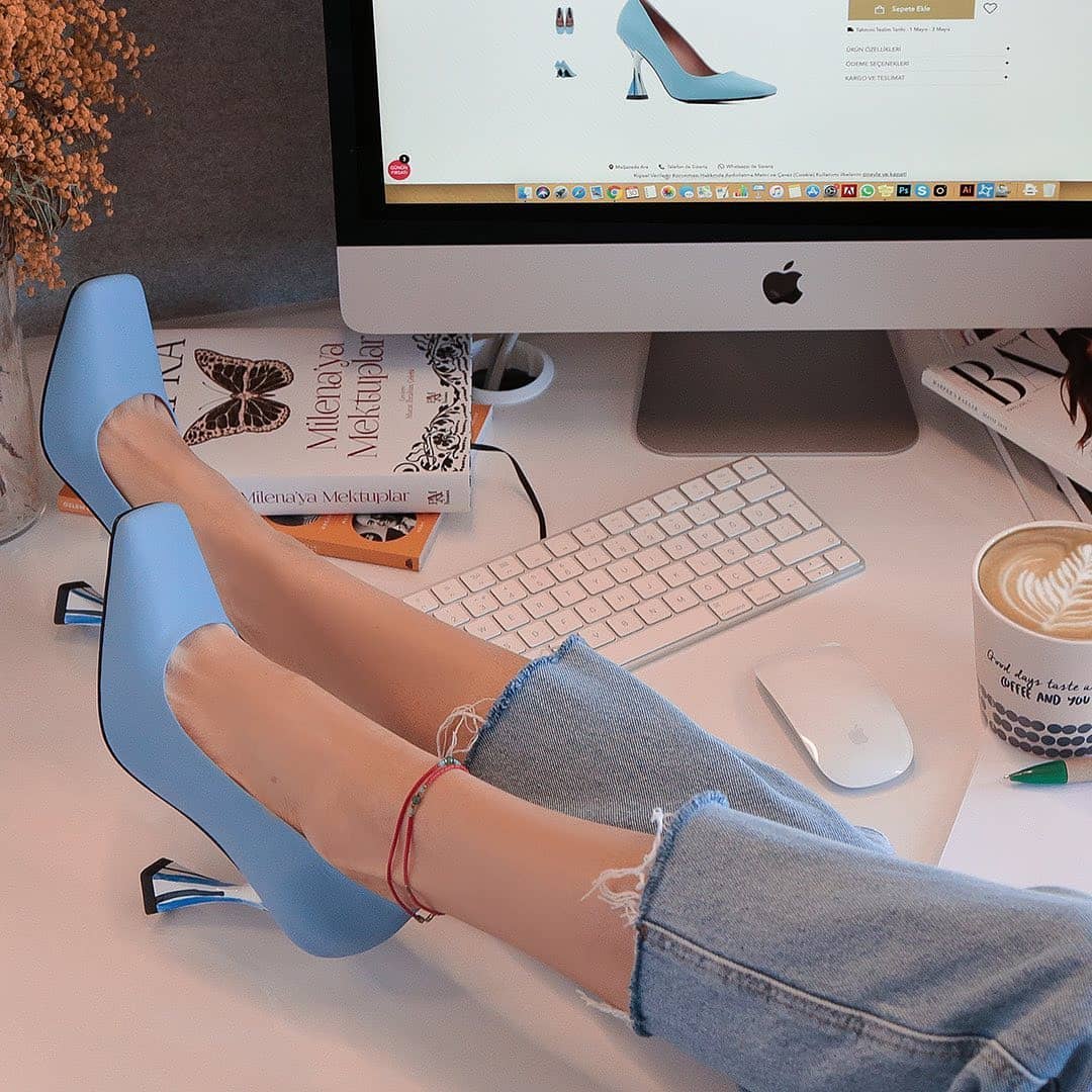 - Синие туфли с низким подъемом лучше носить под юбку или платье, а с высоким – под брюки.