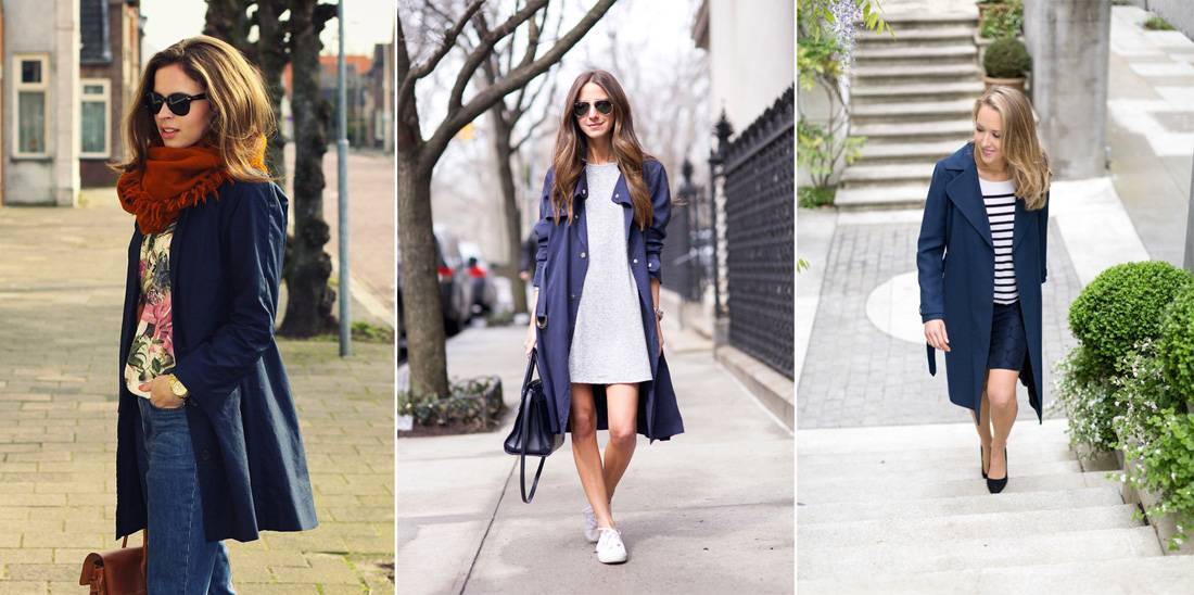 Он подойдет практически ко всему, только не следует забывать применять эффект «осветления». Чтобы не выглядеть сплошным темным пятном, выбирайте блузы, брюки, юбки светлых оттенков. Модным сочетанием будет выглядеть темно-синий плащ с принтованной одеждой (клетка, мелкий цветов, геометрический узор). Разбавить спокойный контраст синего и белого, бежевого, пастельных оттенков поможет красный шарф или хомут.