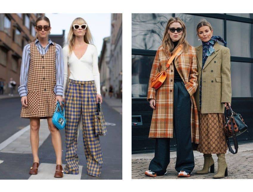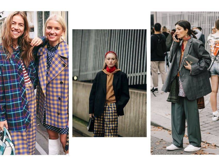 Скандинавский стиль в одежде не обходится без клетки. Такой заметный рисунок, как показано на фотографии, можно сочетать и с полоской, и с клеткой противоположного цвета. К сарафану добавляем рубашку в горизонтальную полоску, а к пиджаку – платье в горох. Для менее экстремальных образов можно выбрать длинное пальто в клетку и комбинировать его со свободными брюками темных тонов, водолазкой и массивными кроссовками с подошвой в оттенок рисунку верхней одежды.