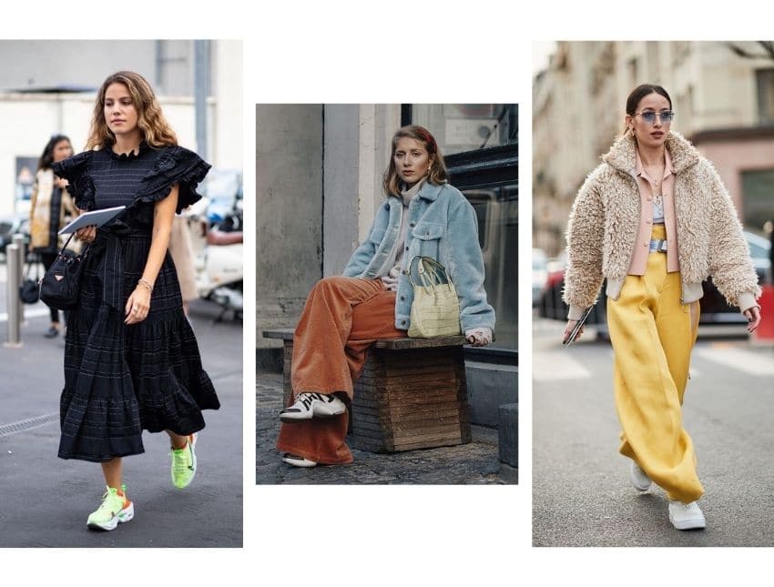 Такую обувь вы можете комбинировать с кюлотами, брюками клеш, джинсами, плюшевой шубой и платьями. Достаем с запыленных полок «папины» кроссовки и добавляем в свой образ.