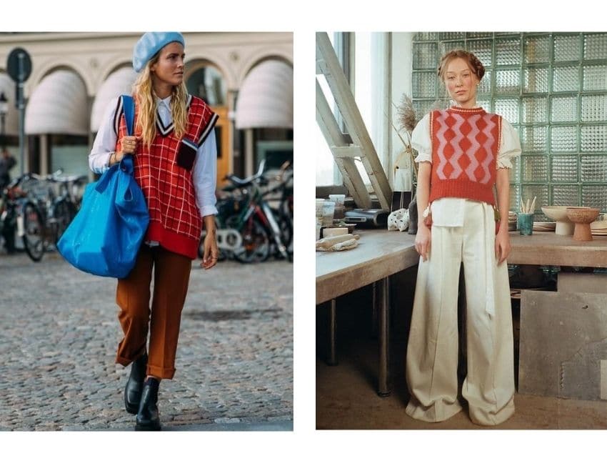 Скандинавский стиль в одежде сложно представить без жилетки, которая всегда была основой образа, а уже потом перешла на мировые подиумы. С помощью этого элемента гардероба можно создавать неординарные многослойные луки. Приобретайте вязаную вещь объемного кроя или с интересным рисунком. Комбинируем с брюками любого фасона и цвета. Под жилетку надеваем блузы и рубашки, водолазки и майки.