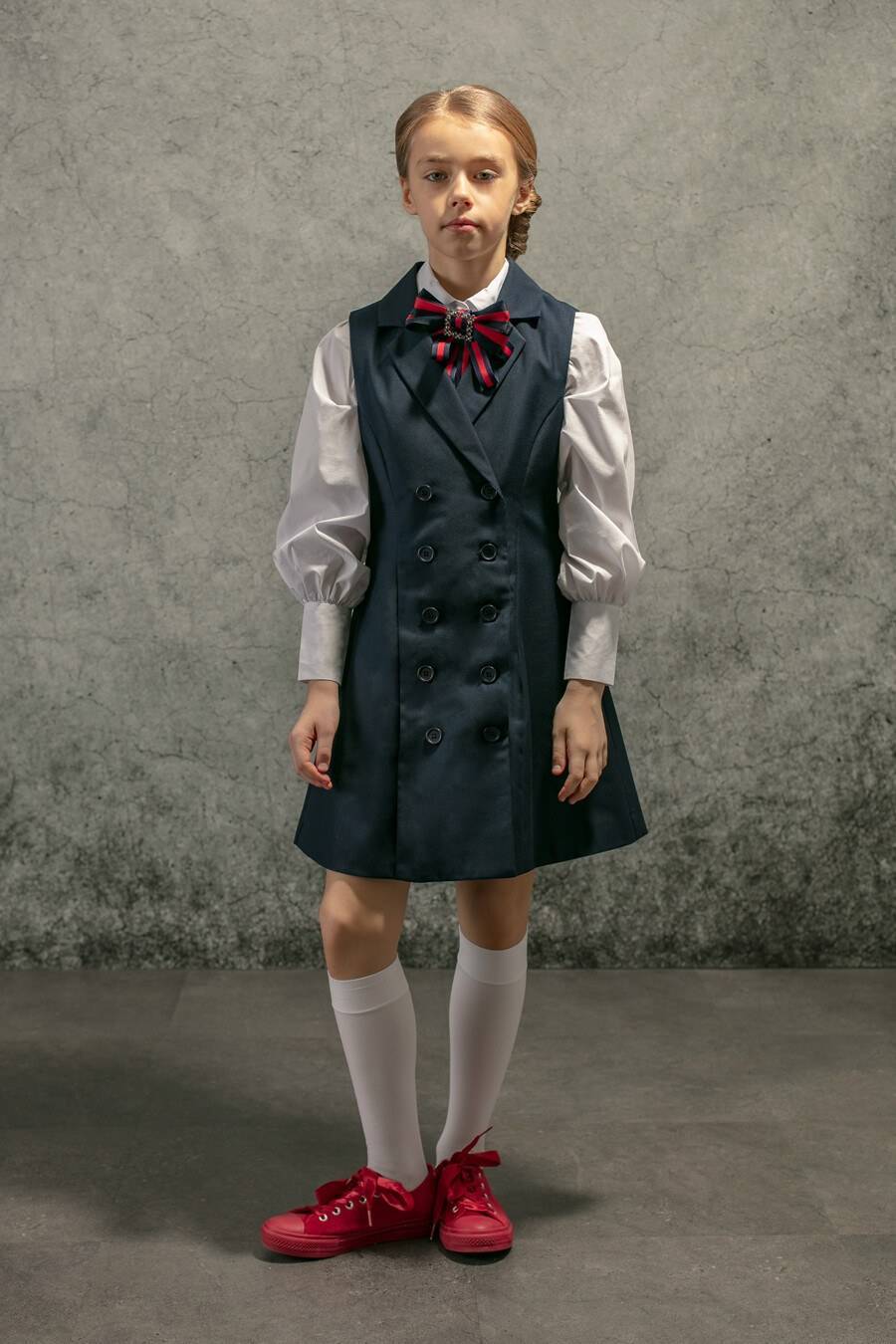 К ним подойдут туфли на шнурках, без каблуков. Прическа с длинными волосами – на усмотрение самой школьницы.