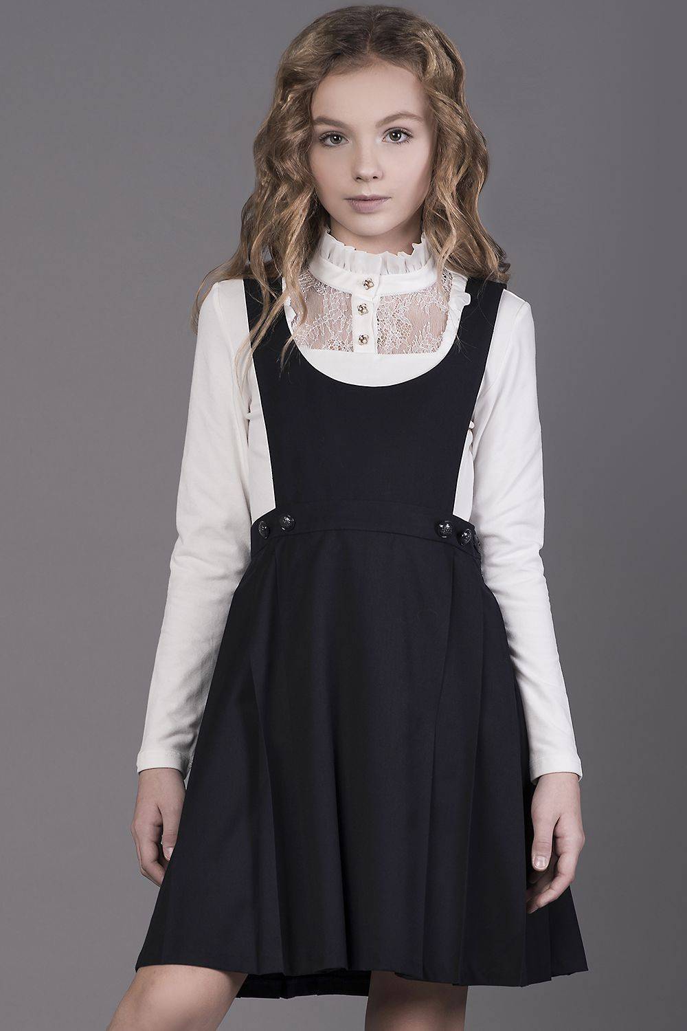 - Черный — этот цвет очень элегантный и строгий. Он значительно стройнит и корректирует фигуру школьницы. Такой сарафан утонченно комбинируется с блузами любого цвета и является самым практичным.