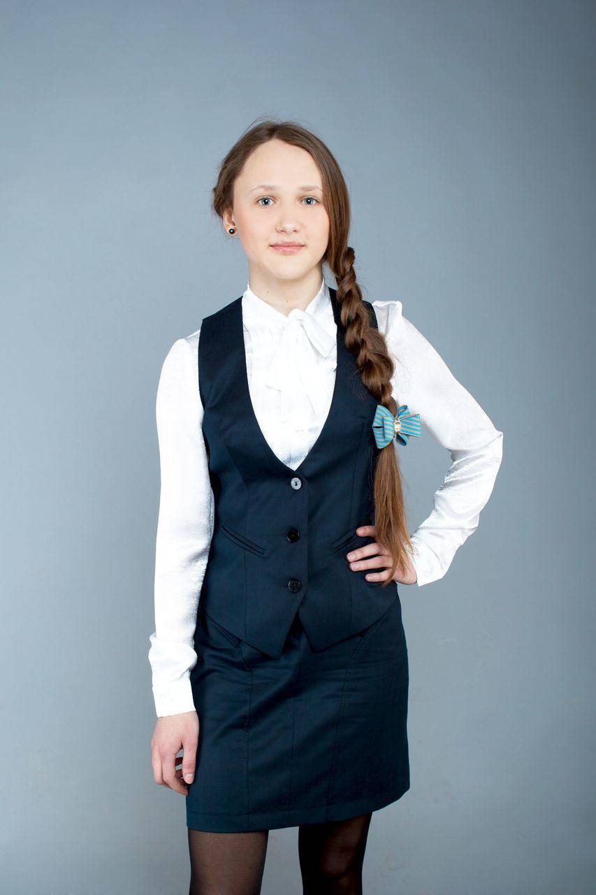 В случае если такой лук кажется очень свободным, его можно дополнить оригинальной жилеткой, задрапированной атласными лентами. Старшеклассницы могут позволить себе более интересные костюмы. Если с фигурой все в порядке, то девочки могут ходить на занятия в юбке-плисе и приталенном жакете с укороченным рукавом.
