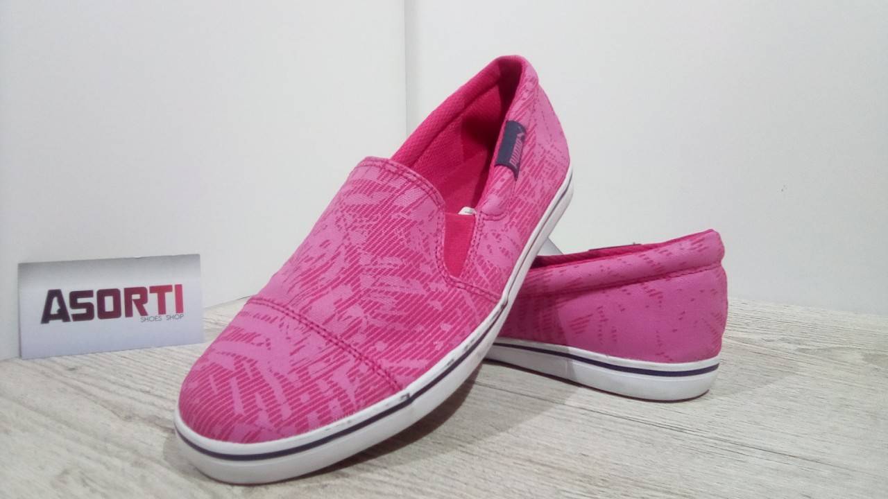 - Pumа. Выпускает слипоны из текстиля, на тонкой подошве, всевозможных цветов, украшенные принтами.