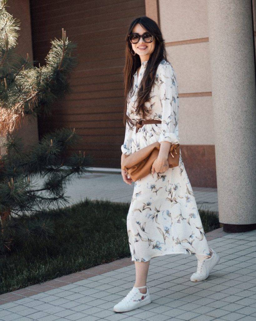 Изысканный и женственный образ получится при сочетании светлого платья с цветочными мотивами и белых кед. Такой спортивный нюанс в женственном образе только подчеркнет элегантность кроя и изящность фигурки. Завершающим аккордом ансамбля станет пояс и сумка коричневого цвета. Аксессуары оттеняют светлый образ, придавая ему цветовую завершенность.