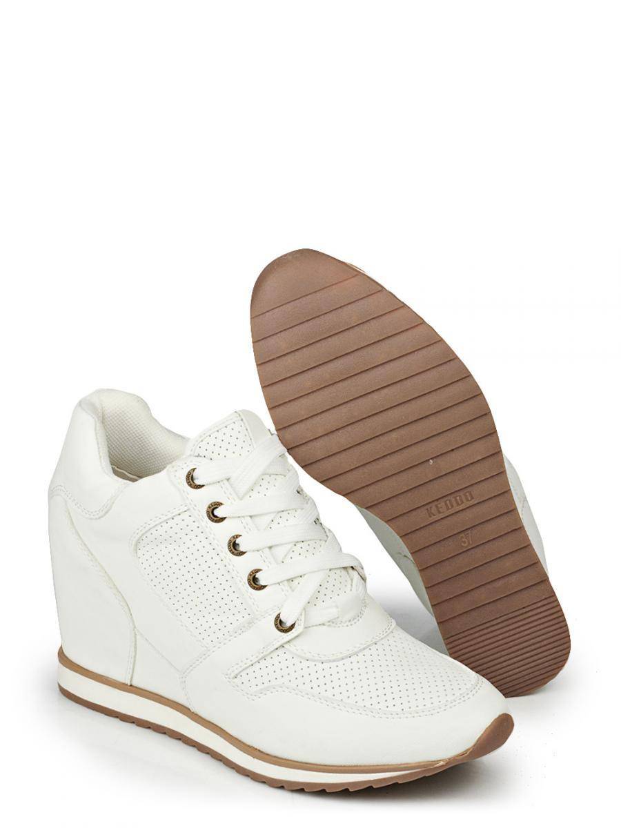 Стильные кроссовки на танкетке хороши в комплектах с широкими, расклешенными брюками, джинсами, легкими юбками.