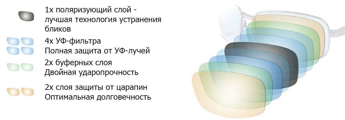 В основе линзы поляризующий фильтр, который имеет с одной и другой стороны по 2 полимерных слоя. Первый предназначен для защиты от повреждений, второй блокирует ультрафиолетовые лучи типов А, В и С. Поглотители вредных лучей, в свою очередь, оснащены буферными слоями для защиты от повреждений механического характера. В конце поверхности линзы обрабатывается специальным образом для защиты от ударов и царапин.