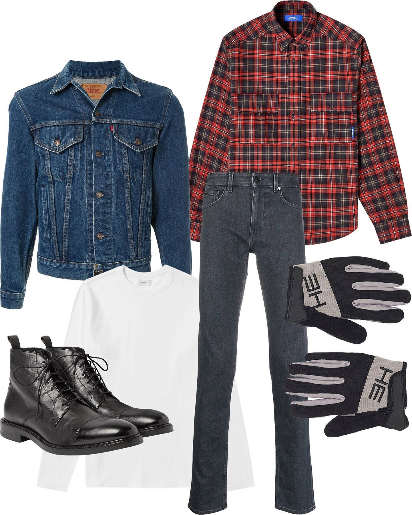 Куртка, Fake Alpha x Levi’s Vintage, 9799 руб. на farfetch.com; рубашка, «Рассвет», 12 759 руб. на endclothing.com; джинсы, Boss, 8385 руб. на farfetch.com; ботинки, Paul Smith, 25 957 руб. на mrporter.com; лонгслив, Les Basics, 1899 руб. на endclothing.com; перчатки, Heliot Emil, 4600 руб. на km20.ru