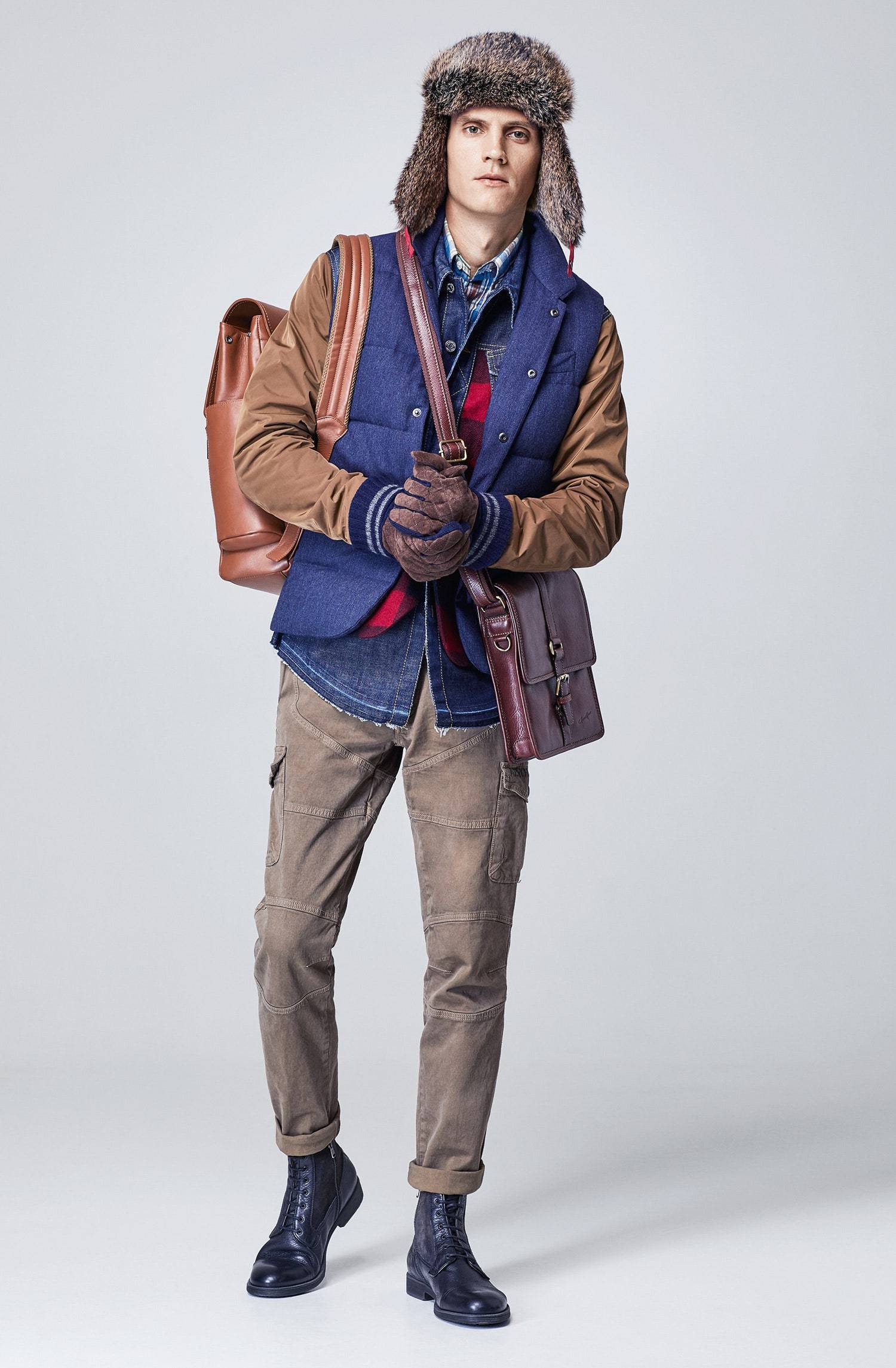 Шерстяной жилет, Ralph Lauren, цена по запросу; куртка из шерсти, хлопка и полиэстера, Dsquared², 64 250 руб.; хлопковая рубашка, Etro, 18 720 руб.; брюки карго из хлопка, Aeronautica Militare, 18 500 руб.; ботинки из кожи и замши, Geox, 13 490 руб.; шапка из меха кролика и полиэстера, canoe, 5000 руб.; замшевые перчатки, Henderson, 1899 руб.; рюкзак из кожи, Dirk Bikkembergs, 40 000 руб.; кожаная сумка, Gérard Hénon, 8390 руб.