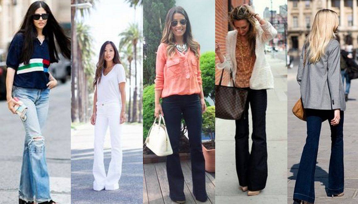 - Расклешенные или прямые джинсы классического синего цвета;
