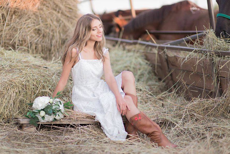 Не стоит упускать из виду тот факт, что кантри – это простота, поэтому будет неуместно чрезмерно нагружать наряд украшениями. Платье необязательно выбирать в одном цвете. А потому есть возможность проявить фантазию и придумать что-то своеобразное. Многие невесты предпочитают изящный наряд с цветочным принтом, который можно достойно подчеркнуть отделкой из мелких джинсовых бутонов.