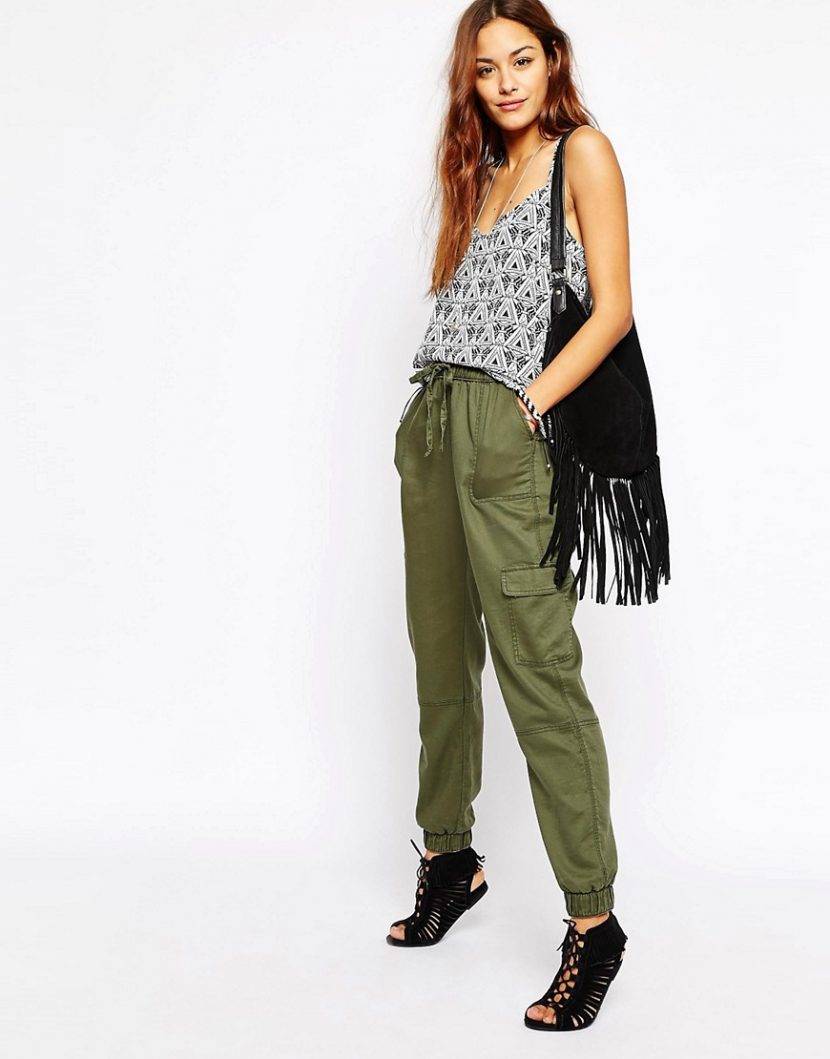 На фото представлены примеры использования в образах одежды в стиле милитари.