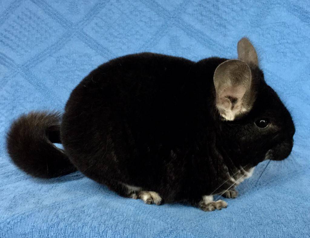 К этим грызунам относят шиншилл оттенка черный бархат, имеющих насыщенный черный оттенок меха и белый живот.
