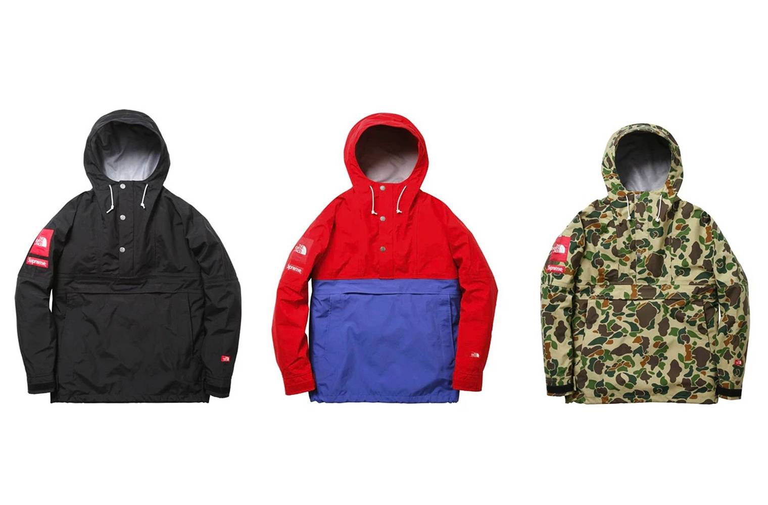 После двухсезонного перерыва Supreme x The North Face представили три анорака Expedition Pullover. В отличие от предыдущих сезонов было выпущено три совершенно разных расцветки — черная, красно-синяя и камуфляжная — за которыми коллекционеры охотятся и по сей день. Несмотря на отсутствие каких-то особых дизайнерских украшений, куртки были оснащены высокотехнологичными элементами, в том числе трехслойным нейлоновым покрытием и проклеенными швами. 100%-водонепроницаемые анораки Expedition положили начало для коллабораций с The North Face, сфокусированных на конструкции и материалах.