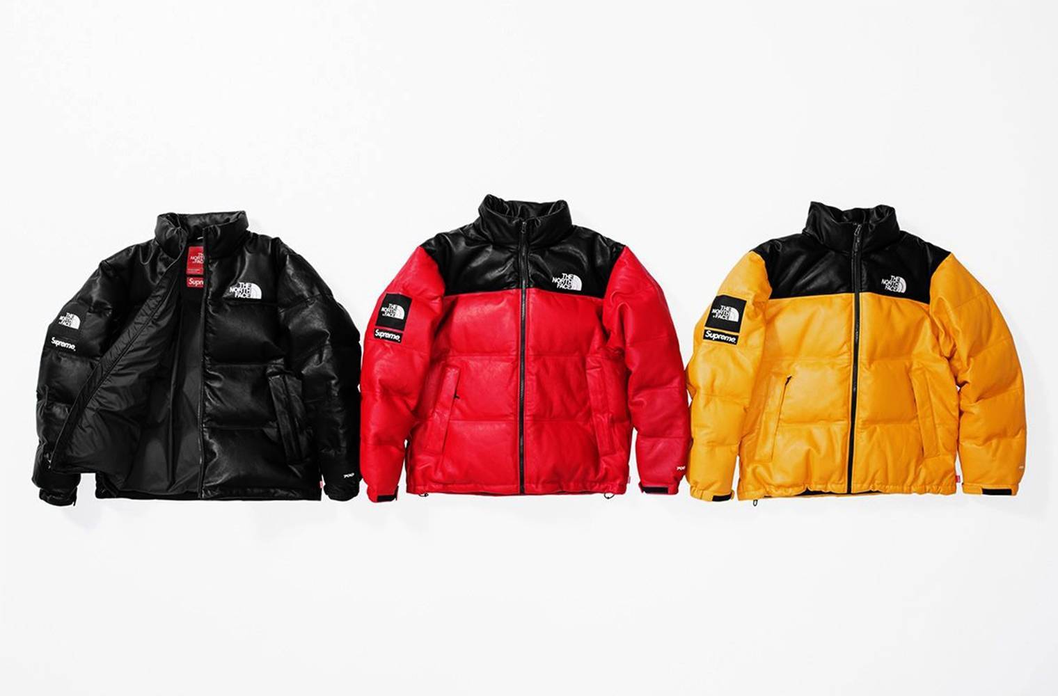 Благодаря растущей популярности каждого дропа The North Face и всё большему объему коллекций после инвестиций от Carlyle Group размером в 500 миллионов долларов, Supreme впервые выпустил в рамках одного сезона две полные коллаборации с The North Face. Если раньше не вся коллекция могла выйти в рамках одного дропа — к примеру, в сезоне Spring/Summer 2017 свитшоты вышли отдельно от курток Steep Tech — здесь в одном сезоне вышли две совершенно не связанные друг с другом коллекции. Первый дроп был посвящен одному материалу — коже. И если куртка Nuptse со стеганой кожей давно является классическим товаром в зимних коллекциях The North Face, то фирменное водостойкое кожаное покрытие бренда использовалось в этой коллекции впервые. Помимо Nuptse кожаную отделку получили рюкзак Roo II Lumbar Pack, сумка-дафл Basecamp и перчатки с подкладкой из овчины. Все они были представлены в трех расцветках: красно-черной, желто-черной и просто черной.