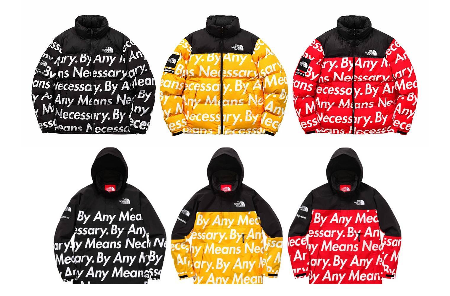 Один из самых знаменитых релизов последних лет, капсульная коллекция «By Any Means Necessary», была первой коллаборацией с The North Face, которая имела отсылку к современной поп-культуре в фирменном стиле Supreme. Фраза, изначально написанная Жан-Полем Сартром в книге «Грязными руками» и относящаяся к упразднению социальных классов («Любой ценой»), стала популярной в последний год жизни Малкольма Икса после его знаменитой речи, отстаивающей базовые права человека независимо от расы. Фраза, напечатанная фирменным шрифтом Supreme — Futura Bold — появилась во всей капсульной коллекции, украсив пуховик Nuptse Puffer, куртку Mountain Pullover, рюкзак Basecamp Crimp, несессер Basecamp Travel Canister и перчатки Winter Runner Glove. Сейчас коллаборация этого сезона, являющаяся, пожалуй, самой «супримовской» из всех коллекций Supreme x The North Face, стала по-настоящему культовой.