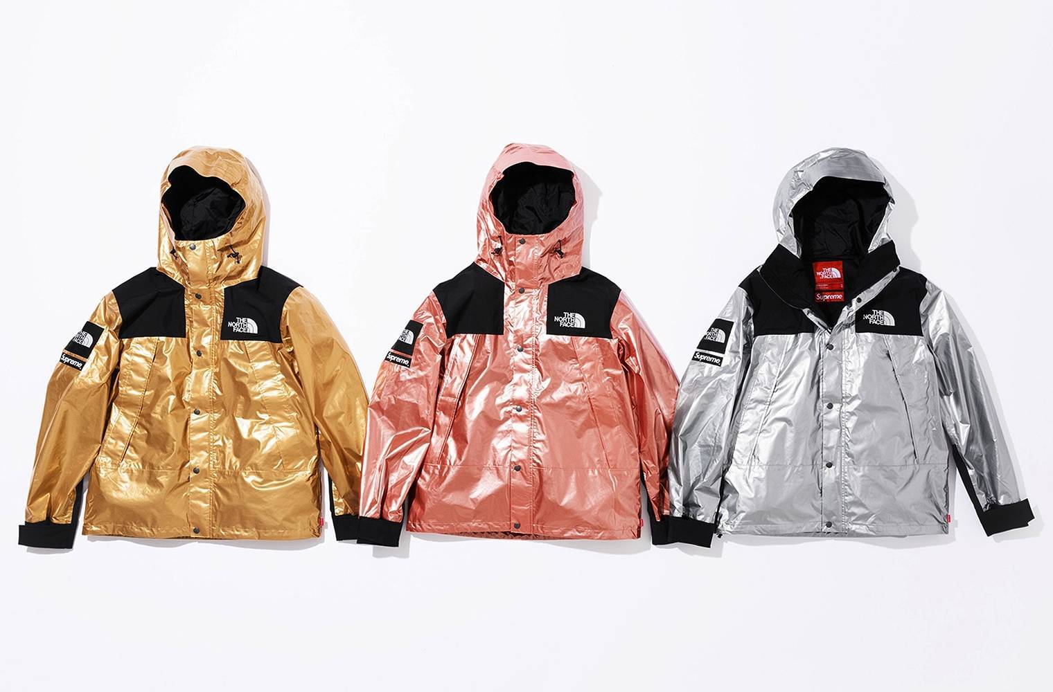 В этом сезоне партнеры снова сосредоточились на определенном материале/цвете — металлике. Коллекция со светоотражающим водостойким нейлоновым покрытием цвета золота, серебра и розового золота включала в себя куртки Mountain Parka, лыжные брюки Mountain Bib Pants, рюкзаки Borealis, сумки Roo II Lumbar и поясные сумки. Помимо переливающихся нейлоновых вещей в дроп также вошли худи и футболки с логотипом The North Face, стилизованным под жидкий металл. И хотя, конечно, дроп не дотягивал до популярности коллекции с двойным бокс-лого, поклонники брендов с радостью его раскупили.