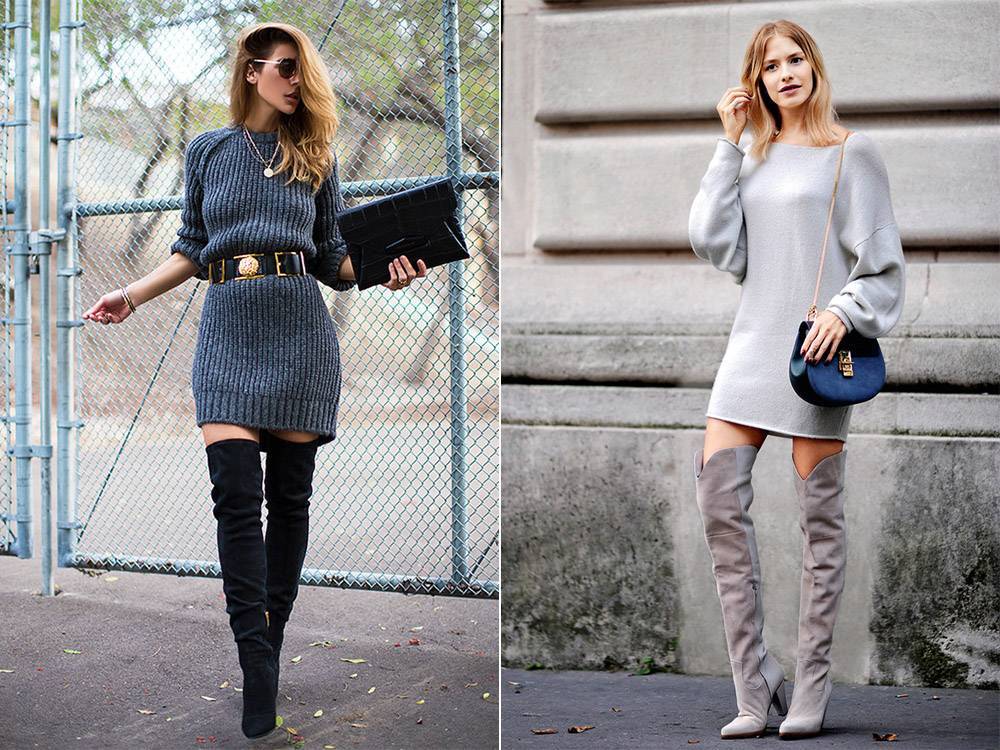 - Если длина свитера до середины линии бедра, то лучше выбрать облегающую юбку до середины щиколотки.