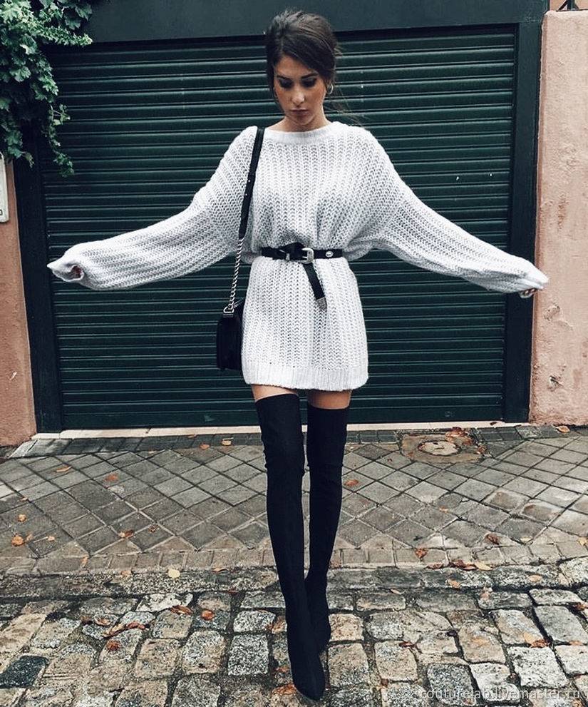 Совет: «идеальная» длина свитера – на пару сантиметров выше середины бедра, свитера длиннее могут немного визуально полнить.