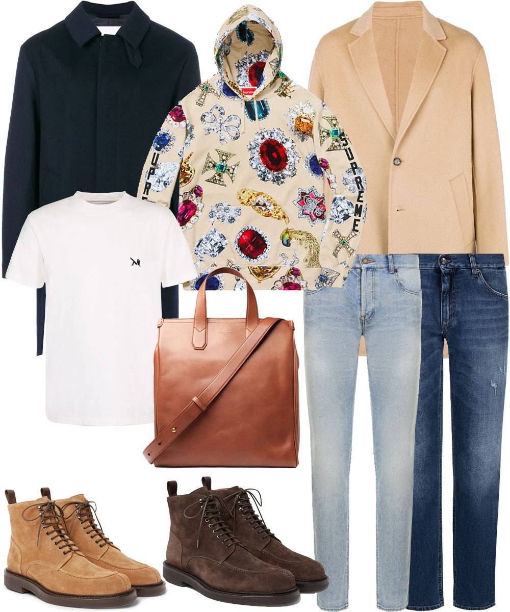 Толстовка, Supreme, €178, на supremenewyork.com; джинсы, Saint Laurent, 46 950 руб. на tsum.ru; джинсы, Dolce & Gabbana, 42 000 руб. на tsum.ru; пальто, Mackintosh, 69 199 руб. на farfetch.com; пальто, Kenzo, 67 750 руб. на farfetch.com; футболка, Calvin Klein 205W39NYC SS19, 11 000 руб. на tsum.ru; ботинки, Mr P., 30 571 руб. на mrporter.com; ботинки, Mr P., 32 370 руб. на mrporter.com; сумка, Dunhill, 129 120 руб. на mrporter.com