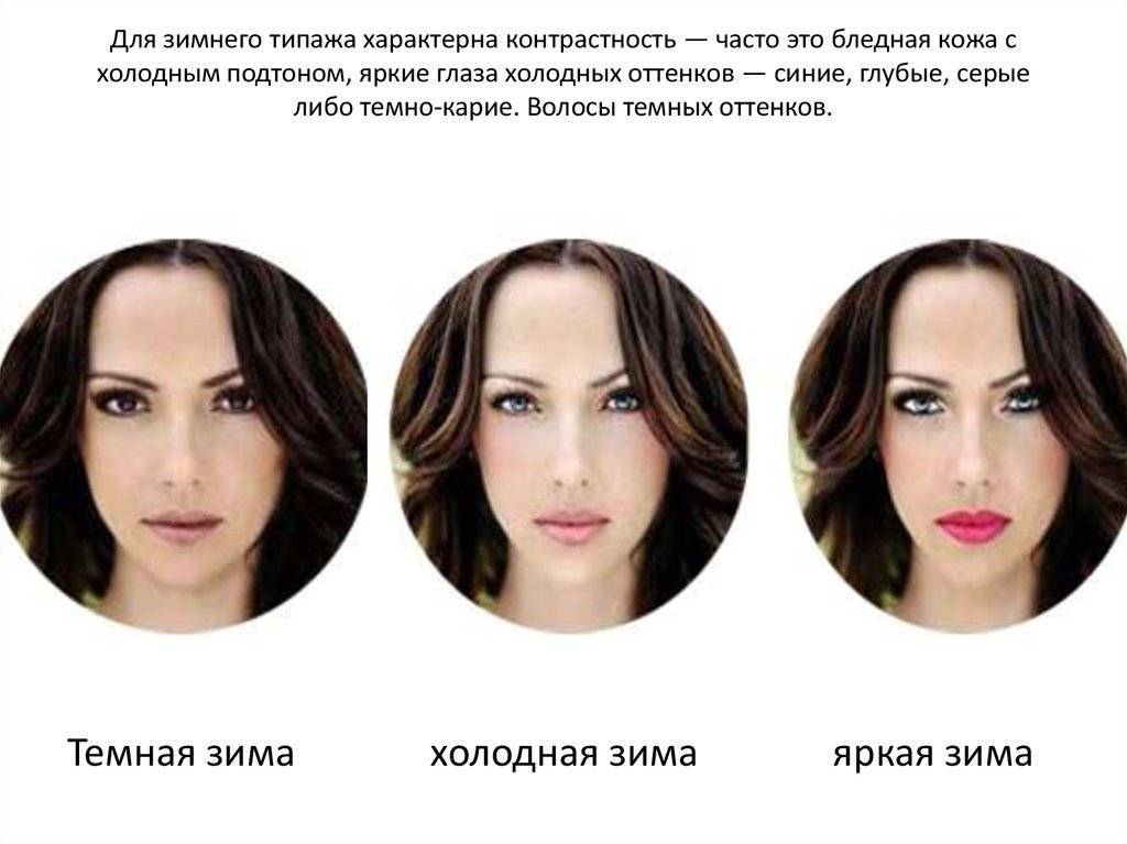 Столь яркий зимний облик отнюдь не однотипен. Как и все остальные, холодный типаж разделяется на еще несколько подтипов. Каждому из них будет дана отличительная характеристика, ведь общих черт у них куда больше. Классическая зима представляется нами как чистый образец сочетания бледной кожи, волос цвета вороньего крыла и глубоких глаз. Нельзя сказать, что «холодная красота» встречается лишь в какой-то определенной национальности — такого типажа девушек и женщин можно встретить повсеместно, но нечасто.