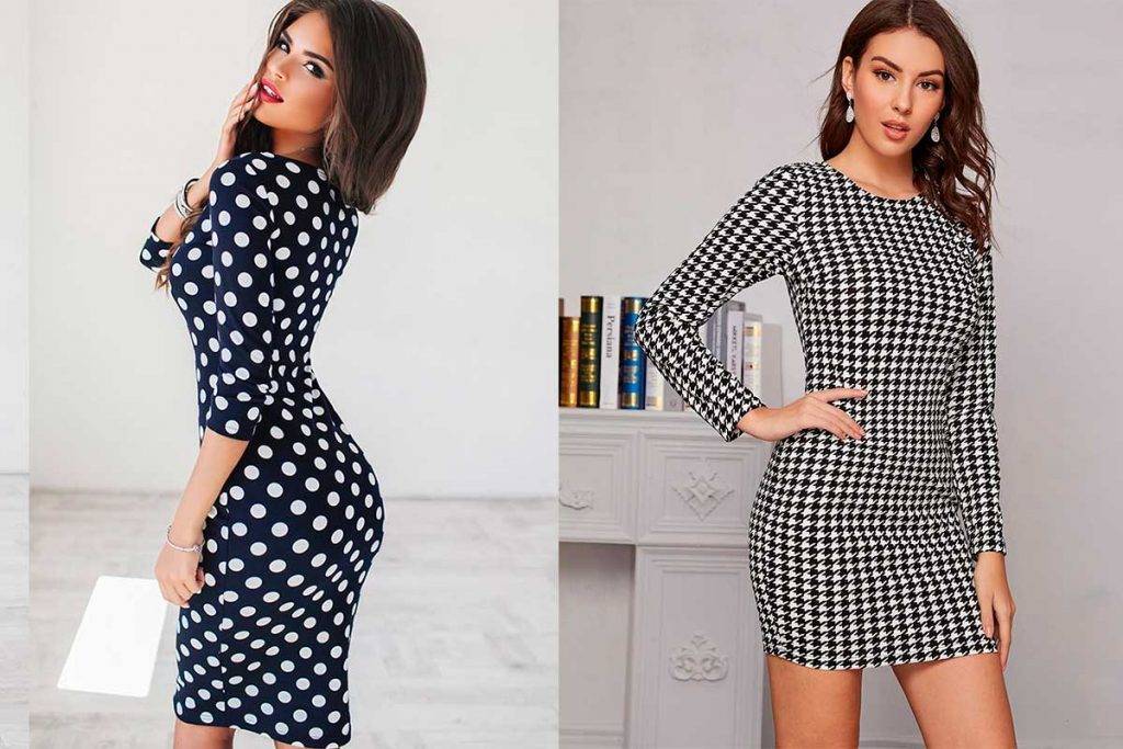 Модное трикотажное платье может включать принты: горошек, полоски, клетки, рисунки.