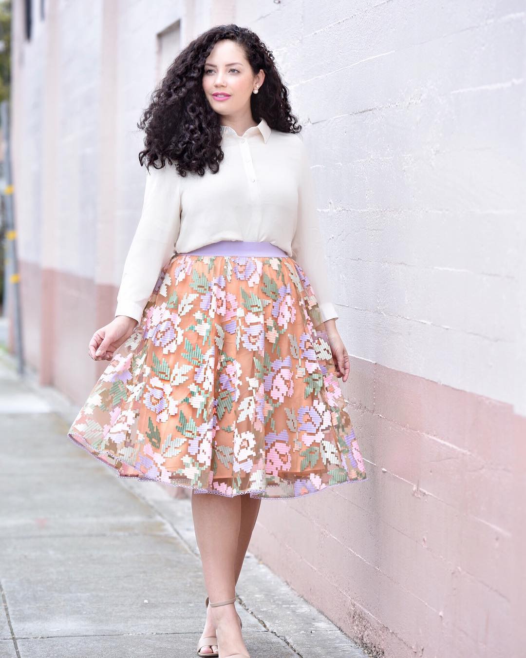 Гармонизировать образ помогут принты, вертикальные полосы, яркие или напротив сдержанные расцветки – мелкие цветочные орнаменты, светлые тона, фатиновые ткани традиционно ответственны за женственность. Важна и посадка вещи, юбку-солнце с высокой талией можно носить с заправленными рубашками и футболками – таким нехитрым способом ты завуалируешь небольшой животик.