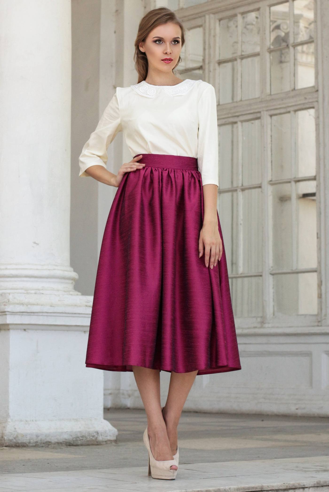 А вот по вопросу «с какой блузкой можно носить юбку-солнце» мнение дизайнеров расходится. Кто-то утверждает, что блуза должна быть максимально строгая и однотонная. Кто-то допускает различные варианты цвета, в зависимости от повода.