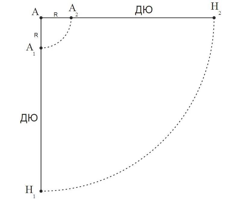- Откладывается два отрезка, равных рассчитанному радиусу. Формируется прямой угол, на каждой его стороне отмечается небольшой отрезок для пояска.