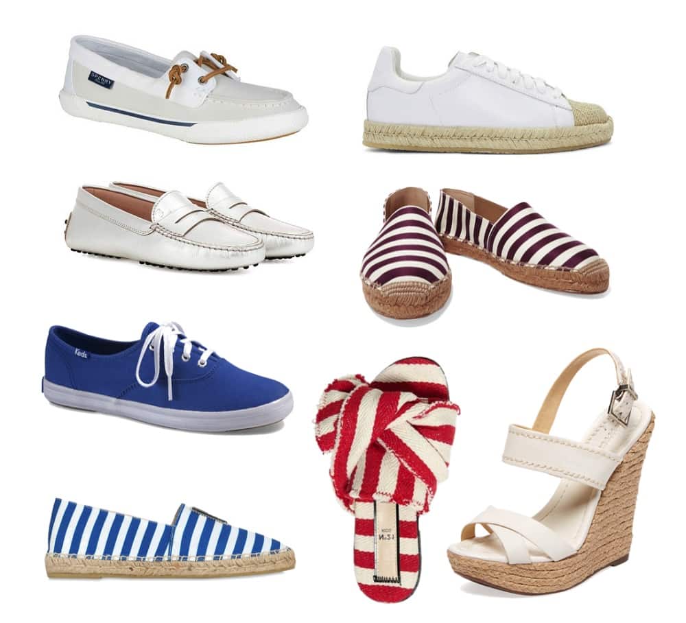 Морской стиль – это преимущественно обувь с текстильным верхом на низкой подошве. Балетки и сандалии, босоножки и даже вьетнамки, кеды и мокасины – отличный выбор для комфорта.