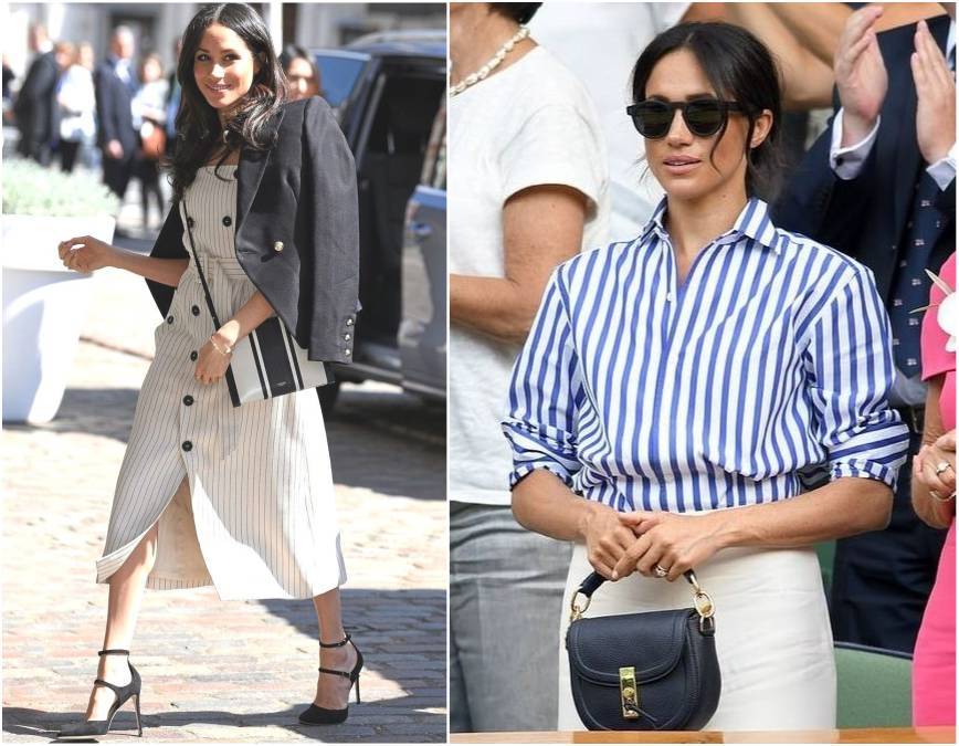 Еще одна представительница королевской семьи Меган Маркл любит облачаться в морские наряды. Герцогиня предпочитает легкие летние платья в полосатый принт, льняные сарафаны, светлые рубашки и брюки свободного покроя, дополненные балетками и солнцезащитными очками.