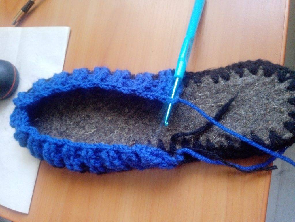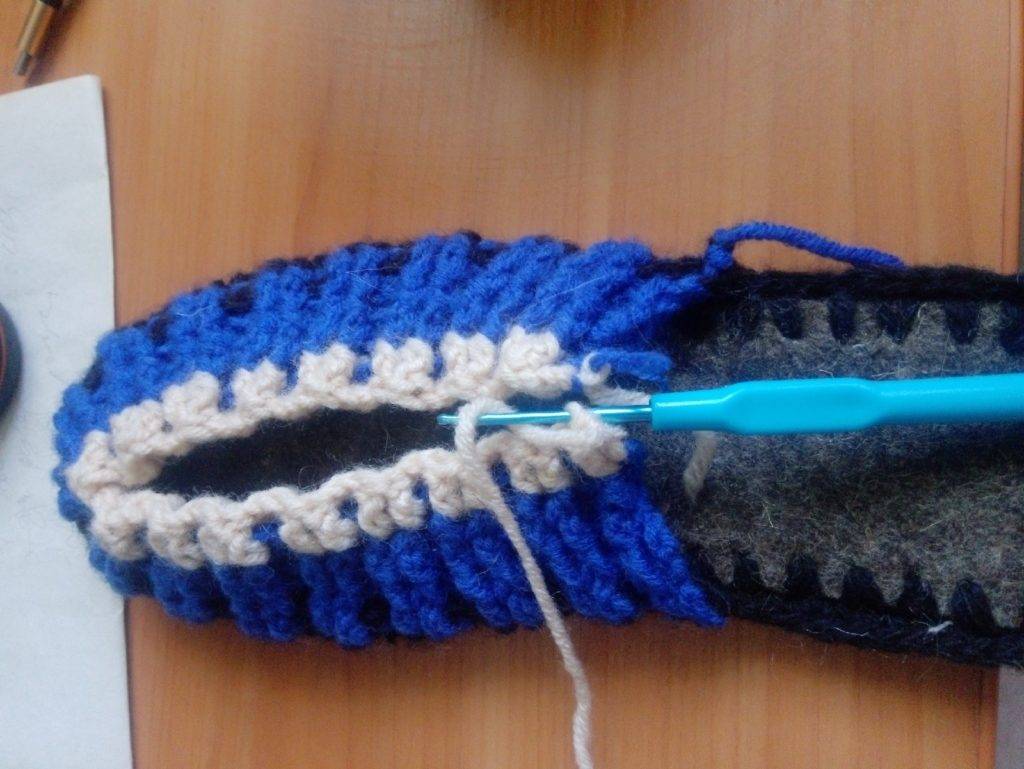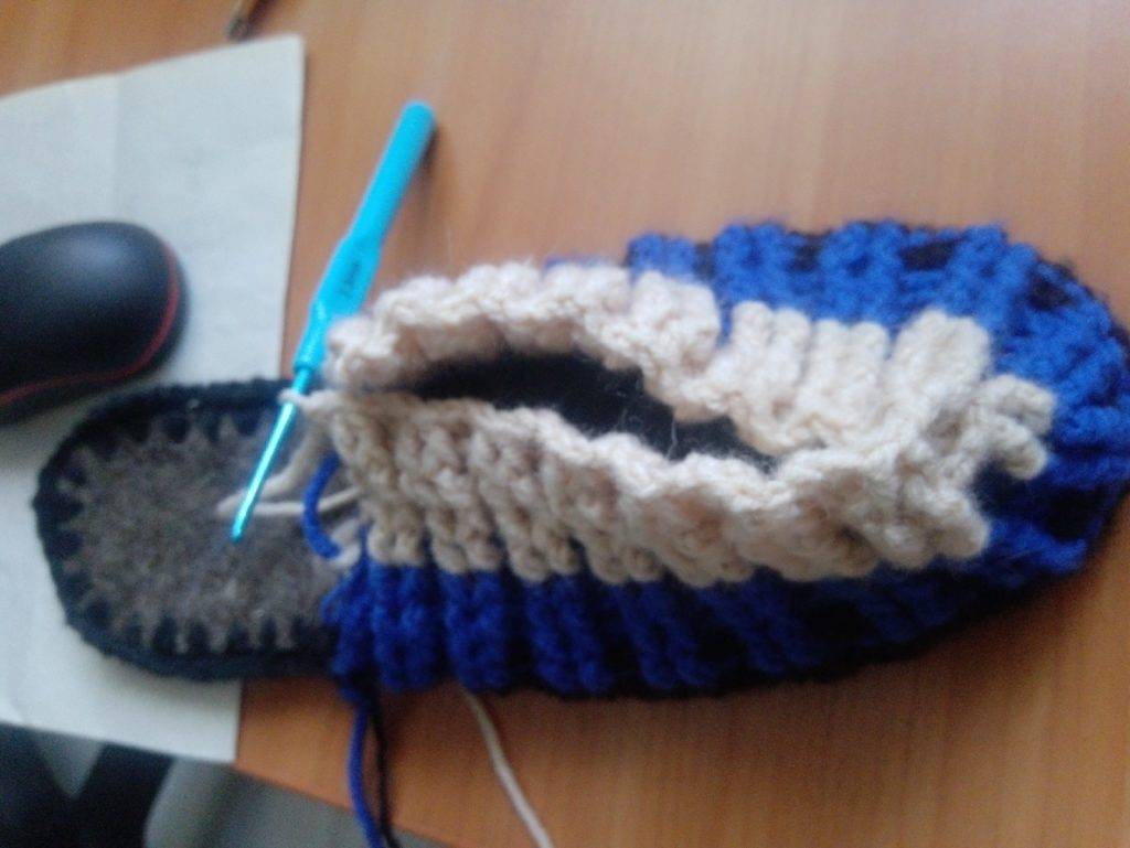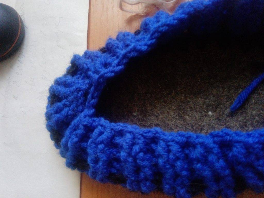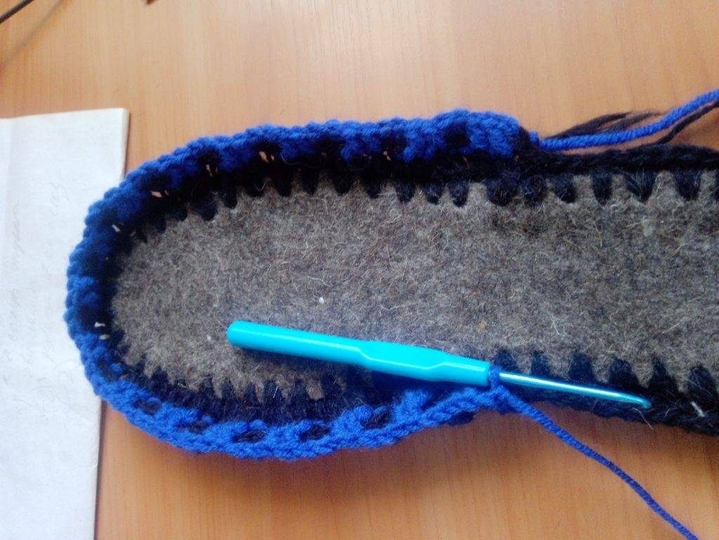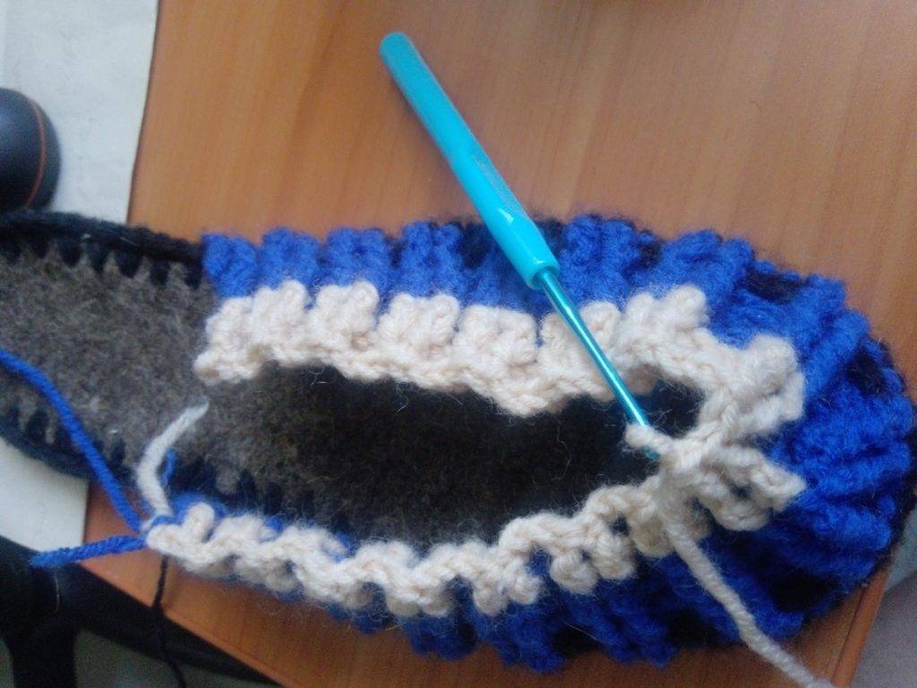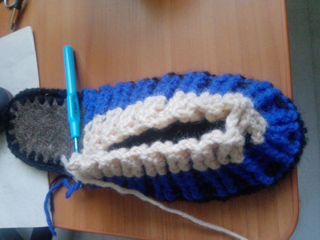 - бортик тапочки — по периметру стельки все петли провязываются ст. с. н., вяжут 2−3 ряда, в зависимости от толщины пряжи;