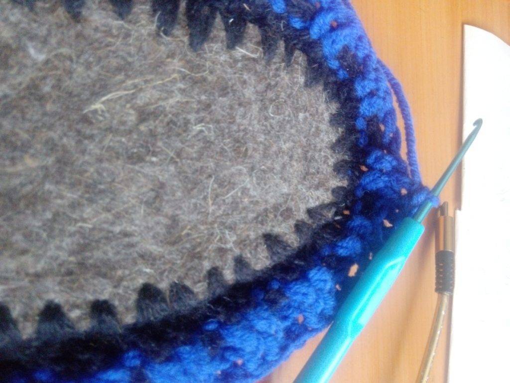 - Дырочки нужны для того, чтобы захватывать в них нитку снизу при обвязывании. СБН на этом этапе вяжутся одновременным захватыванием верха связанной стельки и войлочной подошвы. Пройдя таким способом по всему периметру тапочка, нитку необходимо прочно закрепить, отрезать.