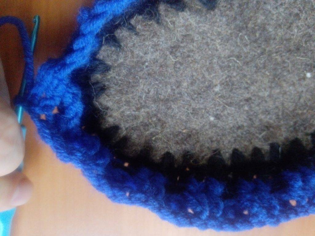 - Вывязывание рядов продолжается до тех пор, пока размер подошвы не будет соответствовать войлочной (или кожаной) стельке. Когда они сравняются, сопоставив обе половины, по наружному краю обвязать их СБН. Если крючком проткнуть подошву не удается, следует заранее в ней проделать отверстия с помощью шила либо «цыганской» иглы. Делать их следует на расстоянии не менее 5 мм от края, поскольку иначе нитки могут прорвать стельку.