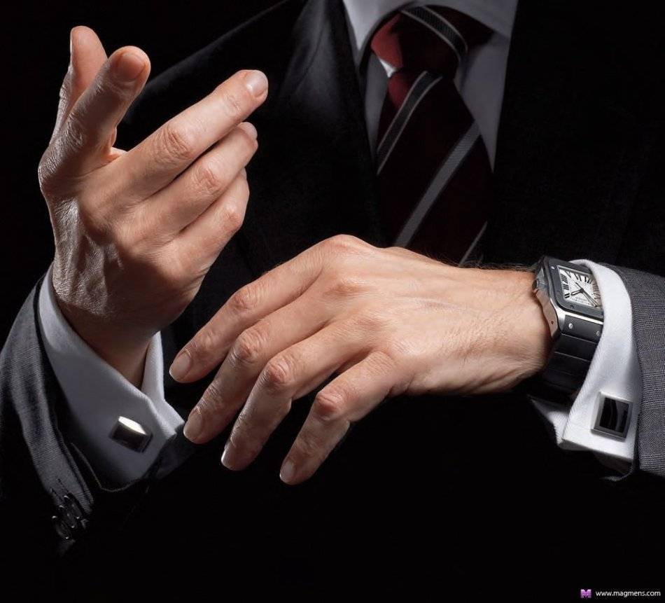 Окончательно дополнят стильный образ дорогие туфли из кожи и аксессуары: портмоне, барсетка, фирменные очки, механические часы, запонки.