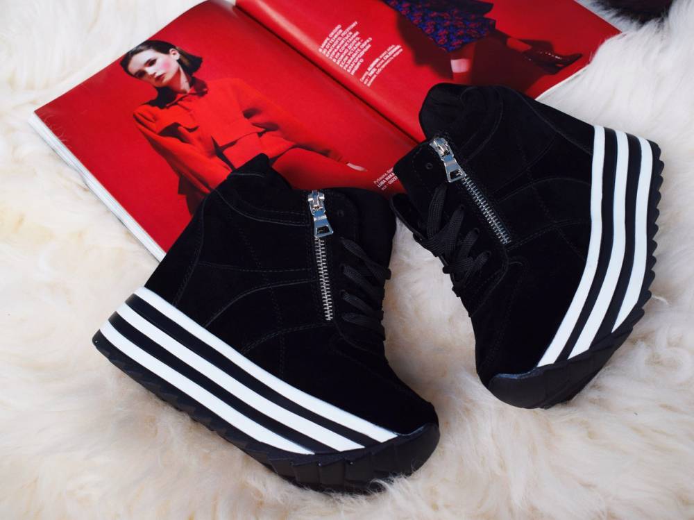 - На танкетке. Такие кроссовки имеют свое название – «сникерсы». Модели выглядят женственно, увеличивают рост, визуально делают ноги стройнее.