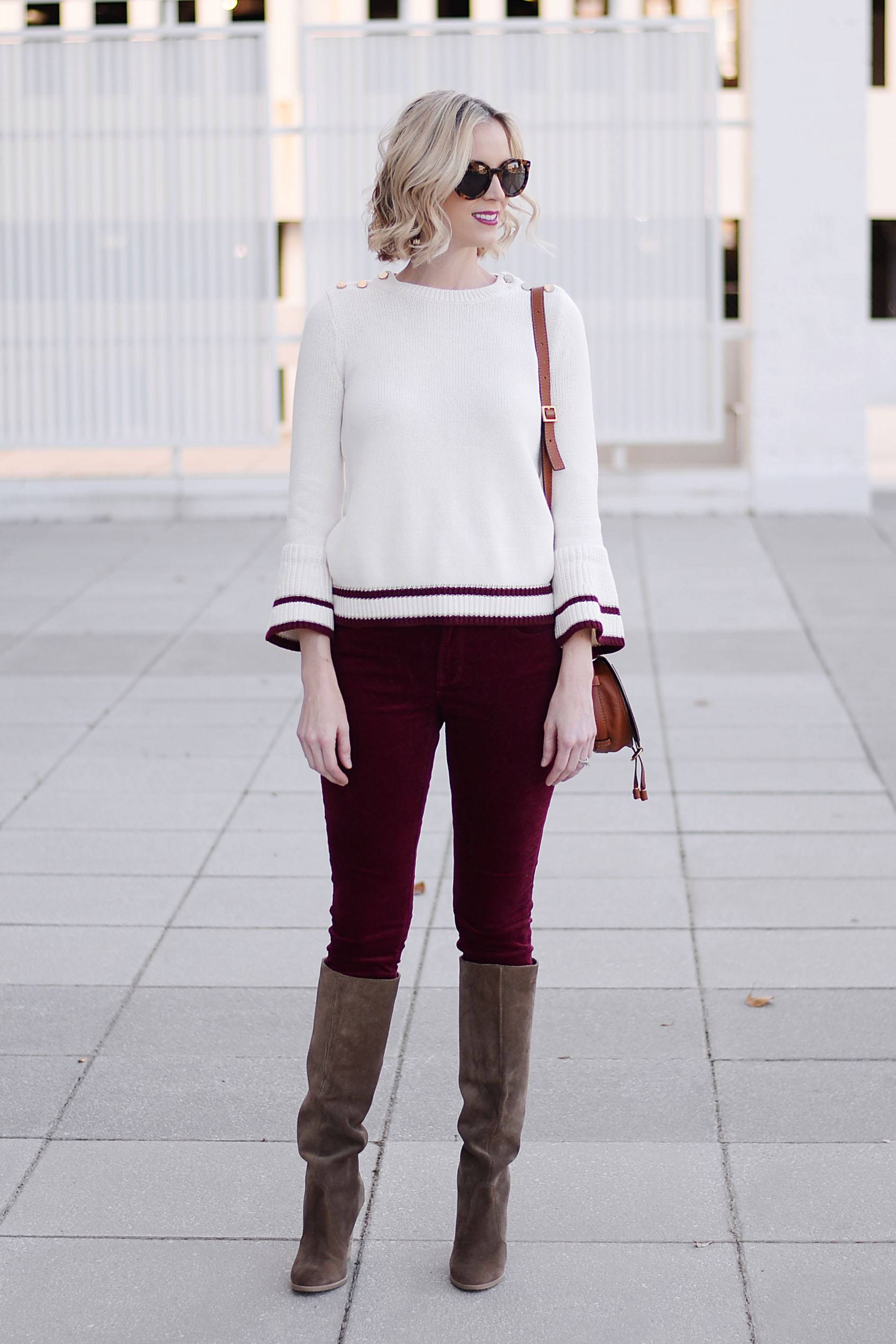 - К сапожкам бордового цвета идеально подойдут бежевые или серые вещи, мягкое вязаное платье.